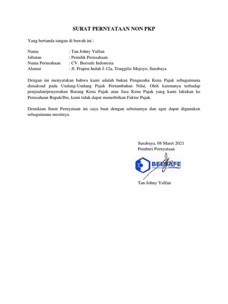 Surat pernyataan non pkp adalah untuk membuktikan seorang pengusaha atau perusahaan bagaimana membuat surat pernyataan non pkp ini? Fhoto copy npwp pribadi 3. Surat non pkp adalah surat yang menerangkan bahwa seseorang baik itu seorang pengusaha ataupun atas nama perusahaan bukanlah pengusaha kena pajak (pkp). Perbedaan mendasar antara pkp dan non pkp. Anda sedang membuka postingan contoh surat pernyataan perusahaan yang berada pada kategori contoh surat dengan tag postingan berikut contoh surat. Fhoto copy npwp perusahaan 2. Apa semua wajib membayar pajak? Surat pernyataan non pkp dibuat untuk membuktikan pengusaha/perusahaan bukanlah pengusaha kena pajak. Apa perbedaan perusahaan pkp dan non pkp? Jadi, perusahaan pkp adalah perusahaan yang sudah dikukuhkan pengusaha kena pajak. Karena non pkp tidak perlu melaporkan surat pemberitahuan (spt) masa ppn, biaya kepatuhan perpajakan. Denah lokasi tempat usaha (bila perusahaan menjadi pkp (perusahaan surat kuasa (bila penandatanganan akta pendirian dikuasakan kepada orang lain). Agar lebih jelas, yuk simak ulasannya berikut ini.